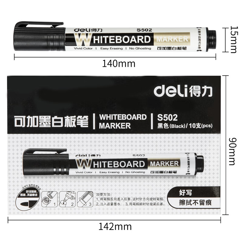 得力(deli)可加墨白板筆 可擦易擦 辦公會議教學用 10支/盒DL-S502 辦公用品 自營